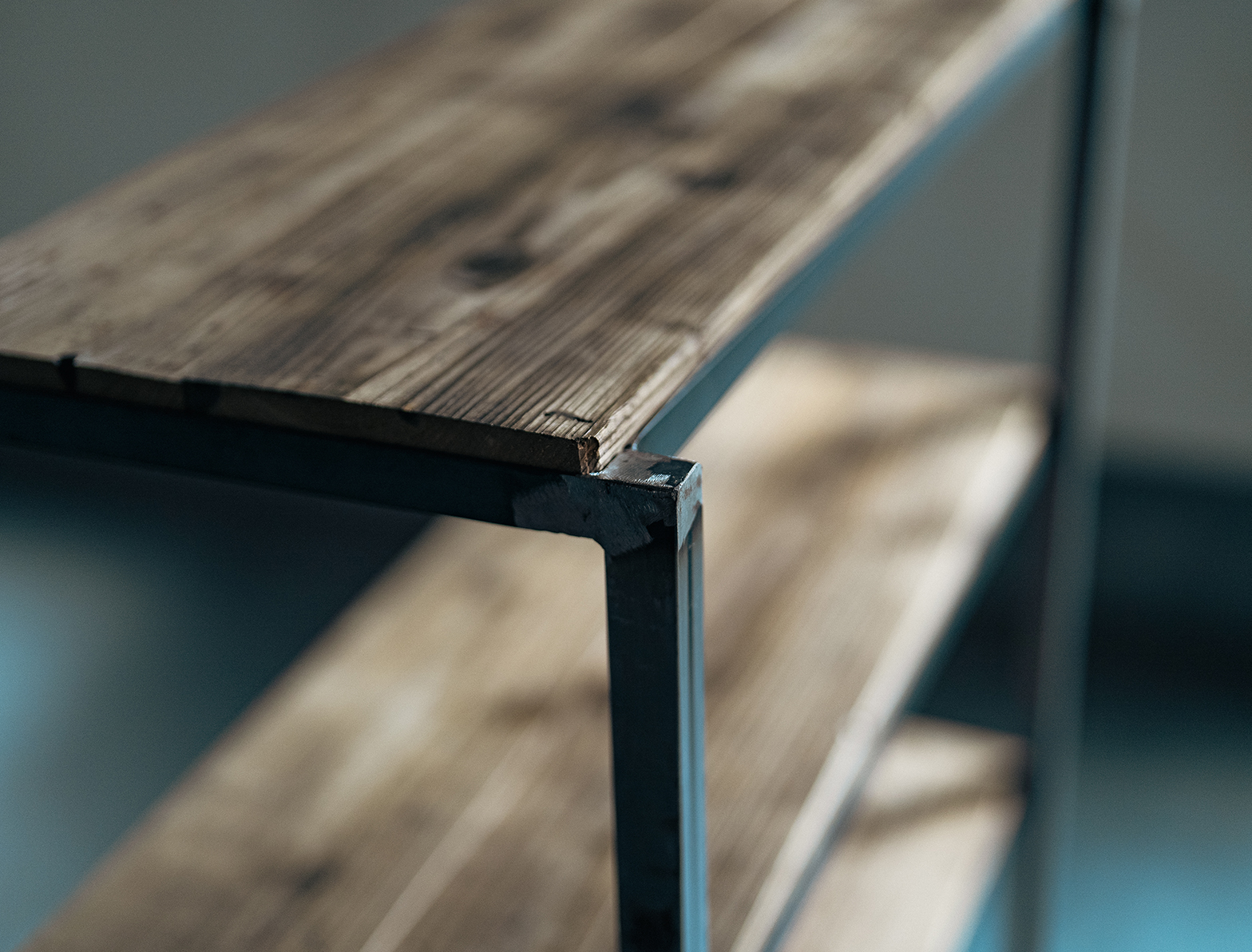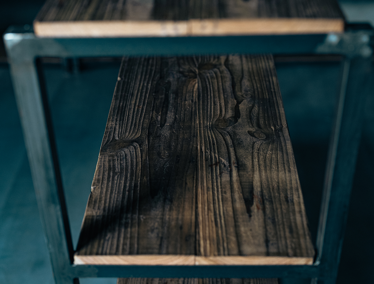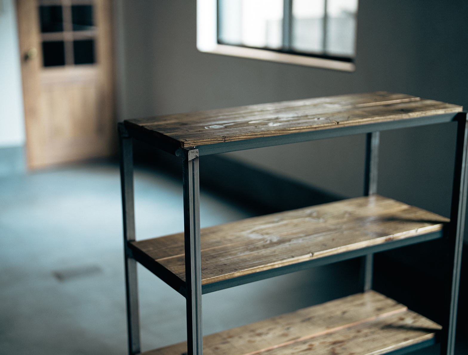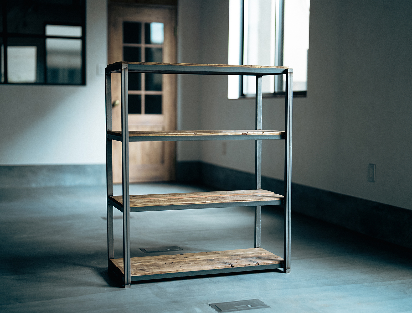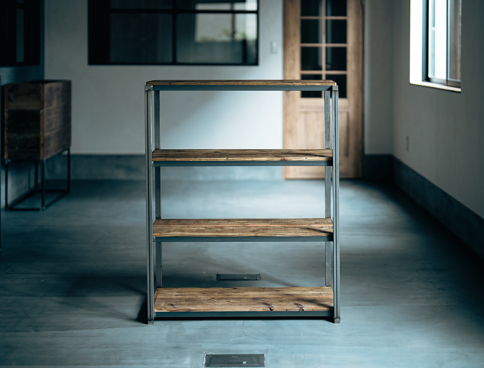 足場板の古材を棚板に使用しアイアンのフレームの中に組み合わせました。 本棚・ショーケースとしても使用していただけます。